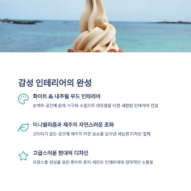 | 우도 여행 코스 중 필수 방문지로 추천 | 우도 특산 땅콩을 적극 활용한 메뉴 구성 | 감성 사진 촬영 스팟, 야외 좌석 이용 가능 |