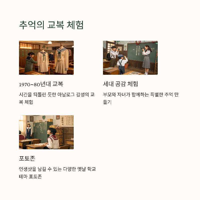 직접 방문했을 때 가장 인상 깊었던 공간은 추억의 교실이었습니다. 교복을 대여하여 입고, 옛날 책걸상에 앉아 사진을 찍을 수 있는 체험이 특히 인기였습니다. 아이들과 부모님이 함께 교복을 입고 사진을 찍는 모습은 정말 보기 좋았고, 가족끼리의 유대감을 더욱 돈독하게 만들어 주었습니다. 또한 추억의 놀이 체험 공간에서는 굴렁쇠 굴리기, 고무줄놀이 등을 실제로 즐길 수 있어 아이들이 평소 접하지 못했던 전통 놀이를 경험하며 큰 웃음을 터뜨렸습니다. 이러한 다양한 체험 요소 덕분에 하루 종일 시간 가는 줄 몰랐습니다.