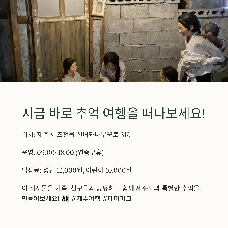 제주도 가족 여행을 계획하고 계신다면, 선녀와나무꾼 테마공원을 꼭 추천드립니다. 과거의 한국을 그대로 담아낸 다양한 전시 공간과 체험 프로그램은 부모님 세대에게는 그리움을, 아이들에게는 새로운 호기심을 선사합니다. 연간 10만 명 이상이 찾는 인기 명소로, 실내 공간이라 날씨에 구애받지 않는 점도 매력적입니다. 교복 체험, 전통 놀이, 달고나 만들기 등 온 가족이 함께 웃고 즐길 수 있는 콘텐츠가 가득해 소중한 추억을 쌓기에 최적입니다. 오늘 소개한 선녀와나무꾼에서 가족과 함께 특별한 하루를 보내보세요.
