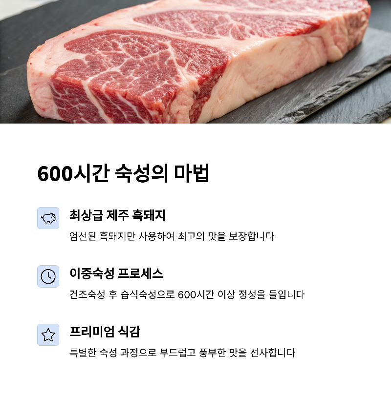 | 고기 및 서비스 | 600시간 숙성 흑돼지, 직원 직접 구워주는 프리미엄 서비스 |