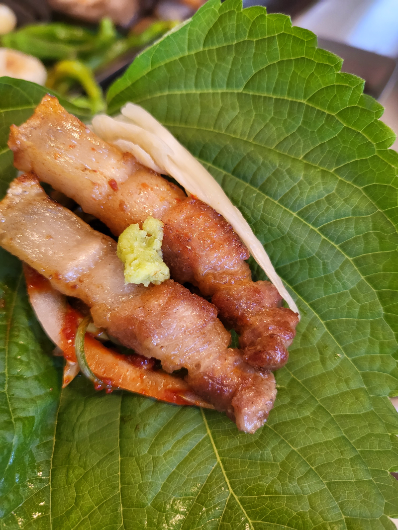 별돈별의 진짜 매력은 역시 600시간 숙성된 흑돼지 고기에서 찾을 수 있습니다. 대표 메뉴인 뼈오삽겹살은 쫄깃하고 깊은 풍미를 자랑하며, 목살과 갈비 역시 입안 가득 풍성한 육즙을 전해줍니다. 또한 고기 맛을 극대화하기 위해 직원이 직접 고기를 구워주는데, 숙련된 손길 덕분에 최고의 굽기 상태를 유지할 수 있습니다. 멜젓, 톳 샐러드, 또띠아 등 다양한 곁들임 음식도 함께 제공되어 맛의 조합을 다양하게 즐길 수 있습니다. 특히 셀프바에서 제공되는 채소와 반찬이 무제한이라는 점은 방문객들에게 큰 만족을 주었습니다.