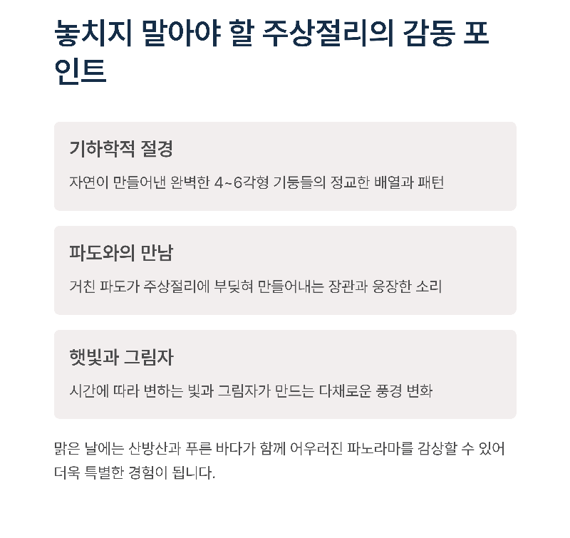| 현무암의 육각 기둥, 최대 높이 20m, 자연 예술 | 일찍 도착해 한적한 풍경 감상, 카메라 지참 권장 | 하루 코스로 이동 가능, 자연과 함께한 힐링 |