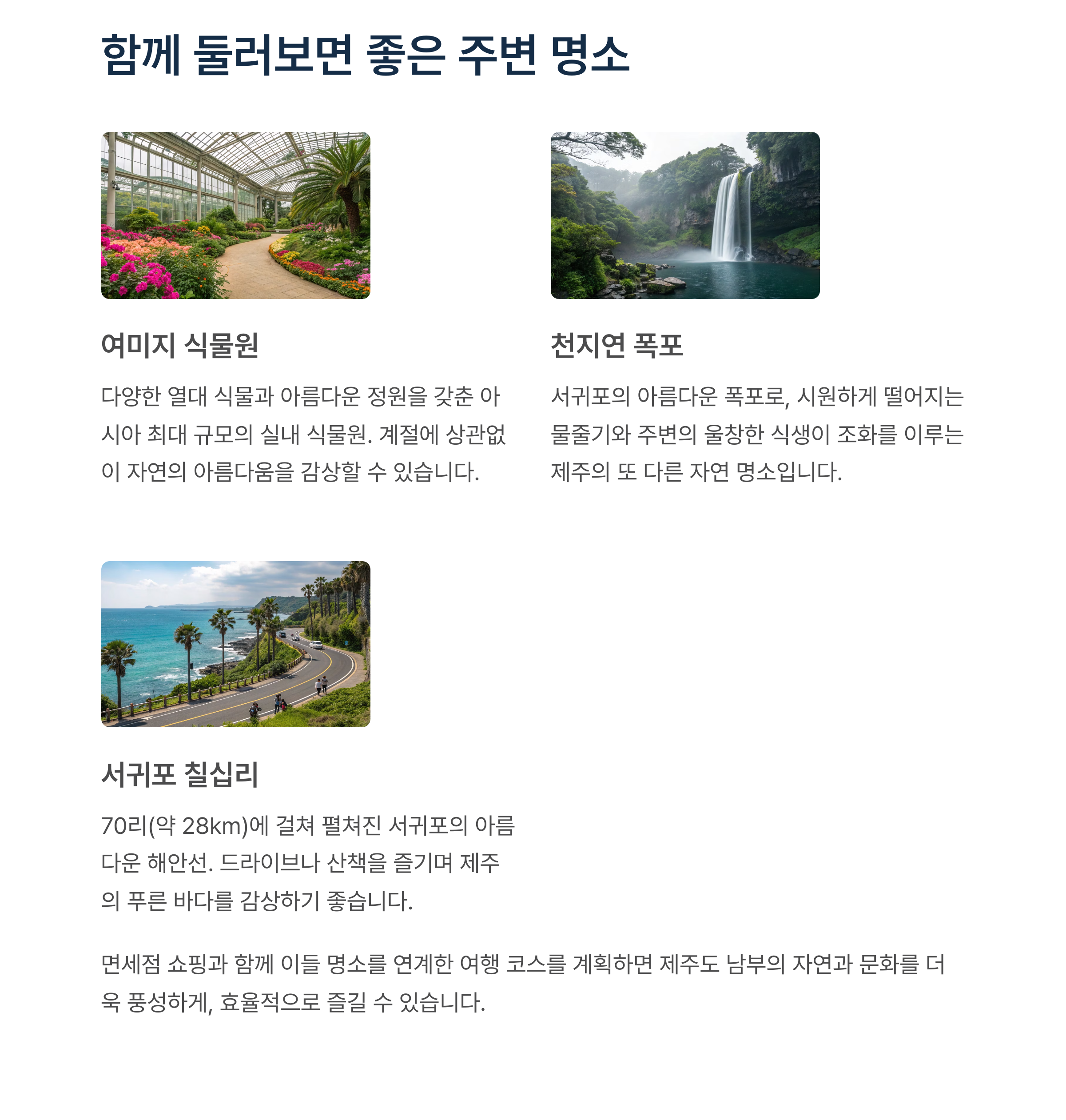 이번 여행에서는 여미지 식물원과 서귀포 폭포도 함께 방문했는데, 하루 코스로 이동하기에 매우 적합했습니다. 특히 중문 주상절리에서 촬영한 사진들은 제주도 여행의 하이라이트로 꼽을 만큼 인상적이었고, SNS에서도 반응이 좋았습니다. 입장료도 저렴하고 접근성도 나쁘지 않기 때문에 가족 단위, 커플, 친구끼리 모두 만족할 수 있는 장소라고 생각합니다. 꼭 편안한 신발을 챙기고, 간조 시간대를 미리 확인해보시길 추천드립니다.