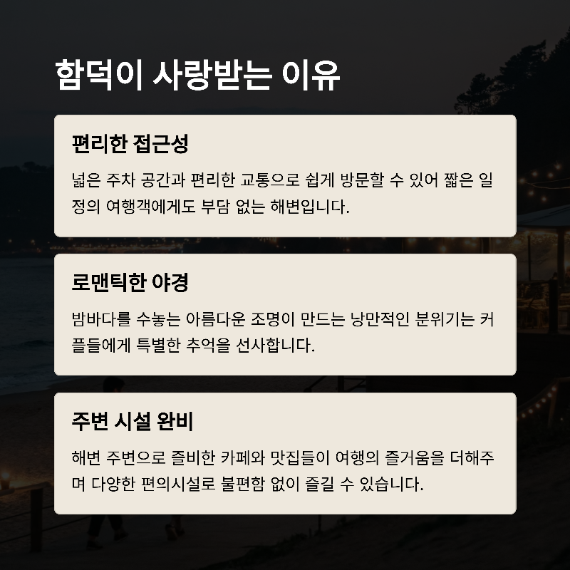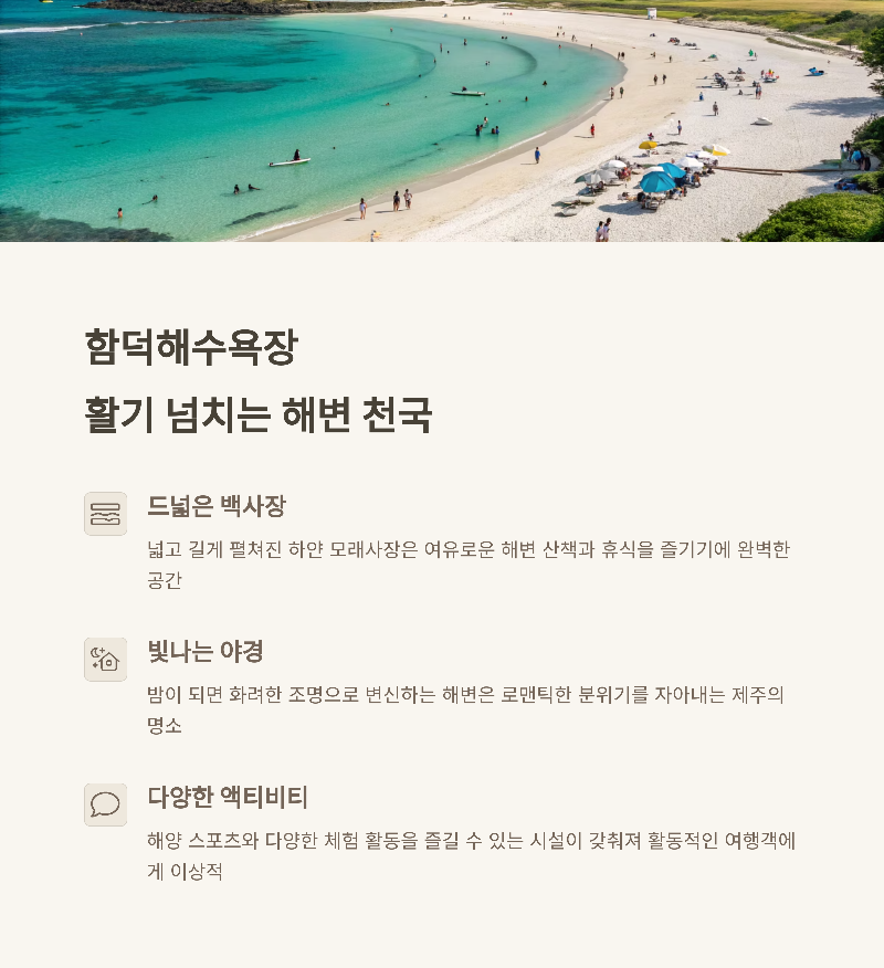 | 함덕해수욕장 특징 | 넓고 시원한 백사장, 노을과 야경이 아름다운 해변 |