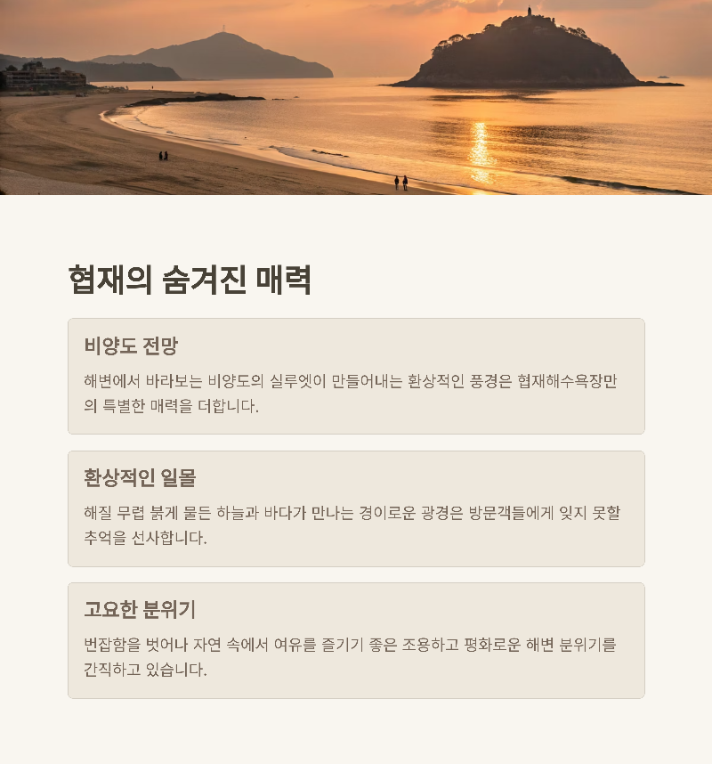 협재해수욕장 특징 | 투명한 바다색과 비양도 전망으로 유명한 해변 |