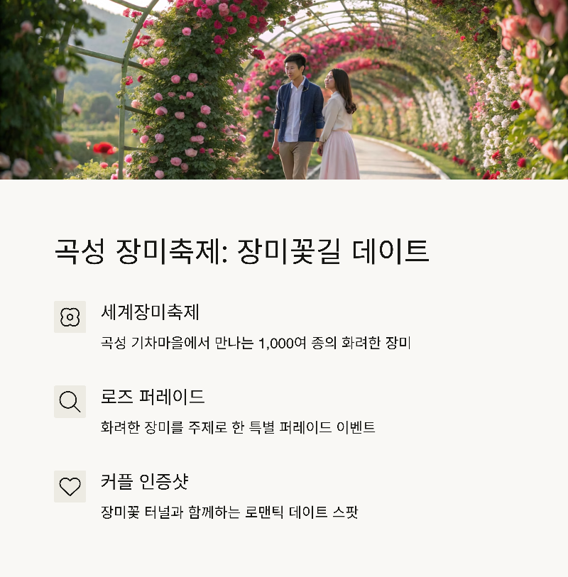 커플들이 선호하는 또 다른 여행지로는 전남 곡성의 장미축제가 있어요. 장미터널을 지나며 끝없이 펼쳐지는 꽃길 속에서 함께 사진을 찍고, 콘서트와 야간 라이트업을 즐기며 특별한 분위기를 느낄 수 있었어요. 장미꽃 향기와 분위기 있는 조명 아래서 기념사진을 남기는 순간은 그야말로 인생샷. 특히 곡성 기차마을 레일바이크는 평범한 데이트를 색다른 체험으로 만들어주었고, 기차역에서 셔틀버스를 바로 이용할 수 있어 편리했습니다.