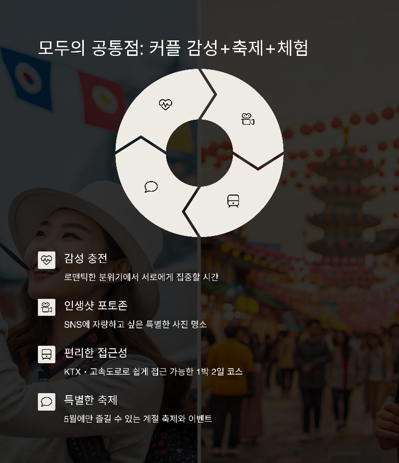| 커플 여행지 추천 이유 | 감성적인 분위기, 포토존, 이색 체험이 가득해요 |