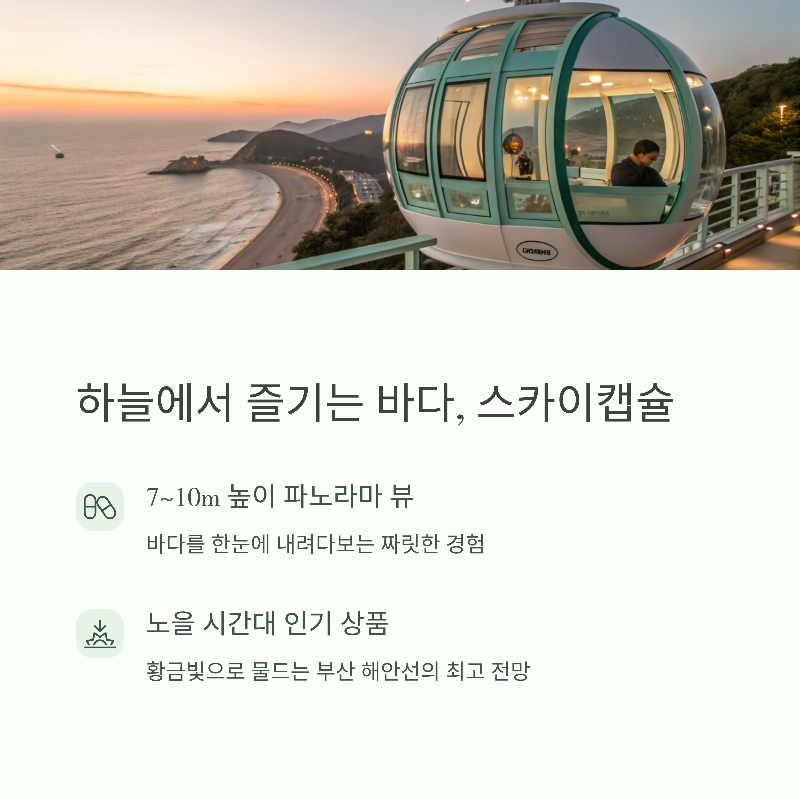 스카이캡슐은 해운대 블루라인파크의 대표적인 체험으로, 미포에서 청사포 구간을 7~10m 높이에서 운행하며 해안 경관을 감상할 수 있습니다. 약 4km/h의 느린 속도로 움직이기 때문에 바다와 도시의 풍경을 여유롭게 즐길 수 있습니다. 요금은 탑승 인원수에 따라 다르며, 최대 4인까지 함께 이용할 수 있습니다. 특히, 노을 시간대인 오후 4시 이후에는 황금빛 하늘과 바다를 동시에 감상할 수 있어 로맨틱한 분위기가 연출됩니다. 온라인 예약 시 할인 코드를 활용하면 더욱 경제적으로 즐길 수 있습니다.