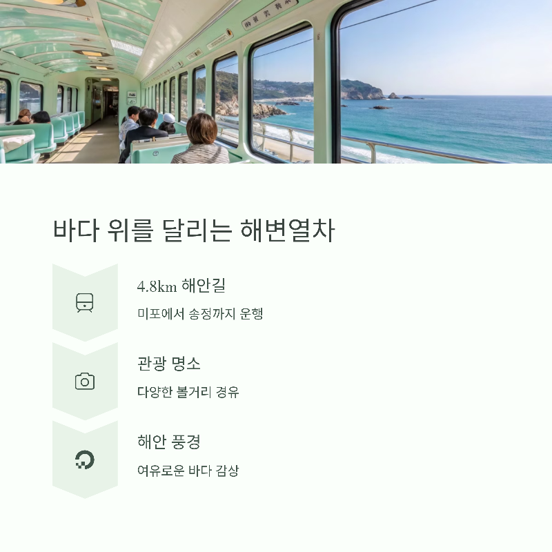 | 미포-송정 해안선 따라 운행하는 열차 | 7~10m 높이에서 해안 풍경 감상 | 온라인 예매 및 할인코드 사용 |