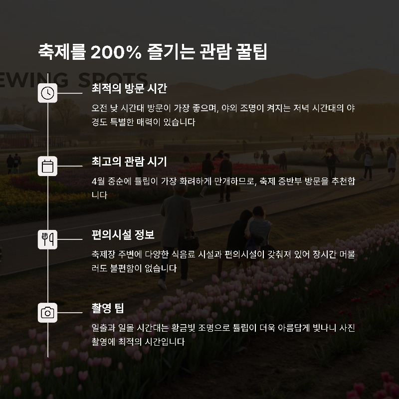 튤립축제에 다녀오신 분들의 소감이나 추천 코스, 놓치지 말아야 할 팁이 있다면 댓글로 공유해주세요. 아직 방문하지 않으신 분들의 궁금증도 자유롭게 남겨주세요! 서로의 경험이 다음 여행자에게 큰 도움이 될 거예요.