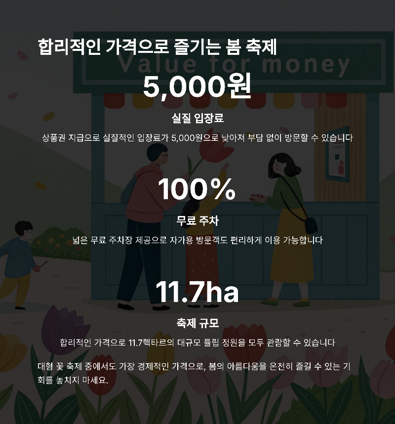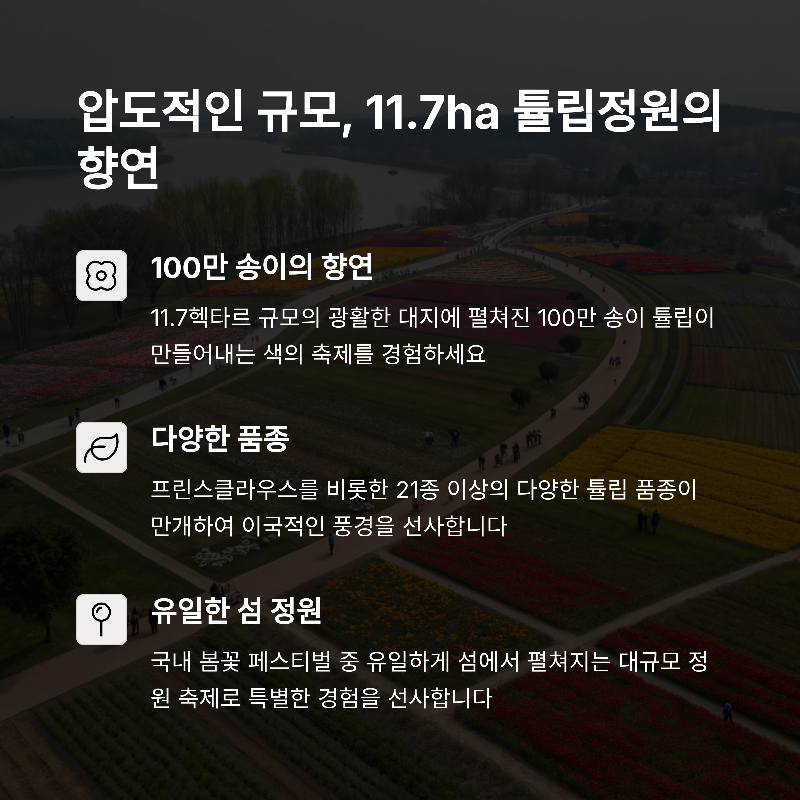 | 무지개 융단처럼 펼쳐진 100만 송이의 꽃밭 | 가족, 연인, 친구와 사진 찍기 좋은 장소 다수 | 남녀노소 누구나 즐길 수 있는 구성 |