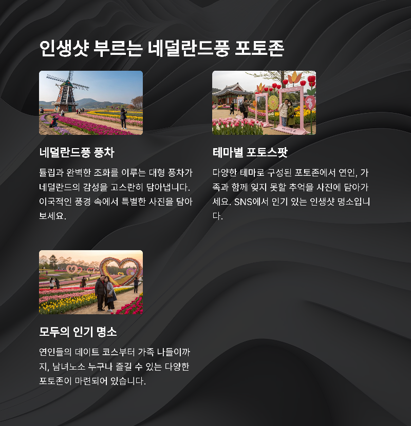 | 튤립 품종 | 주요 포토존 | 체험 프로그램 |