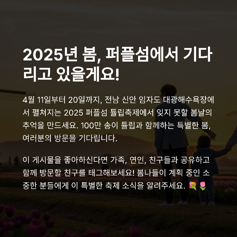 이번 2025년 신안 임자도 튤립축제는 단순한 꽃구경을 넘어 계절을 오감으로 체험할 수 있는 최고의 봄 축제였습니다. 대규모 정원에서 만나는 다양한 색상의 튤립과 풍경, 휴식과 체험이 어우러진 공간 구성은 어느 누구에게나 힐링이 되는 시간이었습니다. 특히 가족 단위 방문객들에게 적합한 프로그램과 유리온실, 포토존, 지역 예술 공연까지 풍성한 콘텐츠는 “내년에도 꼭 다시 오고 싶다”는 마음이 들게 했습니다. 실질 입장료 5천 원이라는 착한 가격과, 섬의 아름다움이 더해진 이번 여행은 2025년 봄, 가장 기억에 남는 순간으로 남을 것 같습니다.