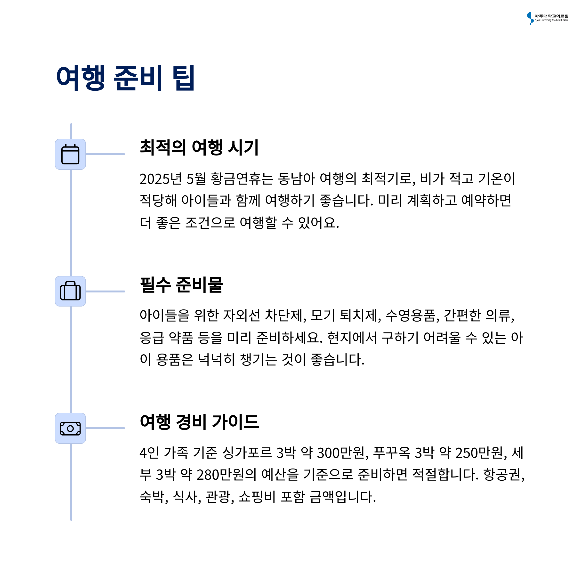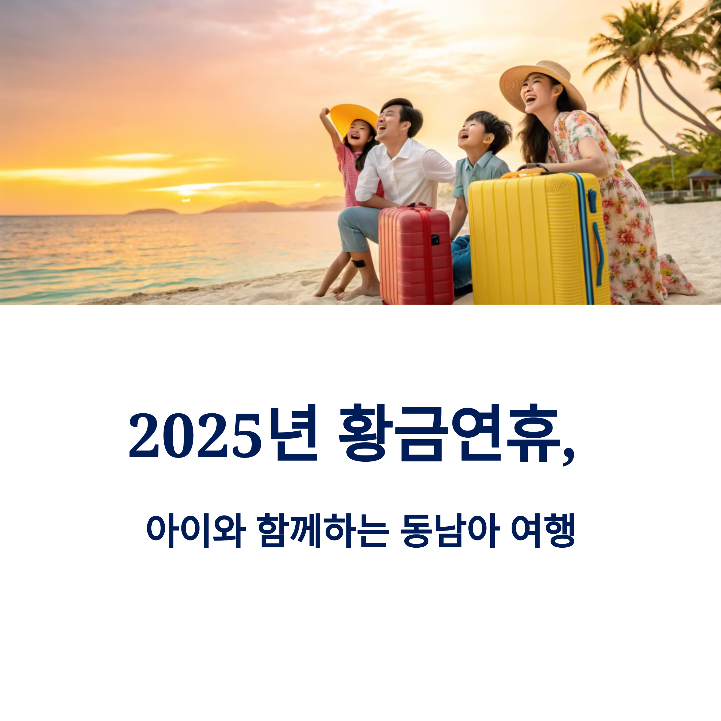 안녕하세요, 여행을 사랑하는 여러분! 2025년 5월은 근로자의 날(5월 1일), 어린이날(5월 5일), 그리고 대체공휴일(5월 6일)로 이어지는 황금연휴가 있어 가족 여행을 계획하기에 최적의 시기입니다. 특히 아이들과 함께하는 여행은 특별한 추억을 만들 수 있는 소중한 시간인데요. 오늘은 짧은 비행시간과 다양한 액티비티, 그리고 안전한 환경을 고려하여 아이와 함께 가기 좋은 동남아시아의 여행지 세 곳을 소개해드리겠습니다. 각 여행지의 특징과 매력을 살펴보며, 가족과의 완벽한 여행을 계획해보세요!