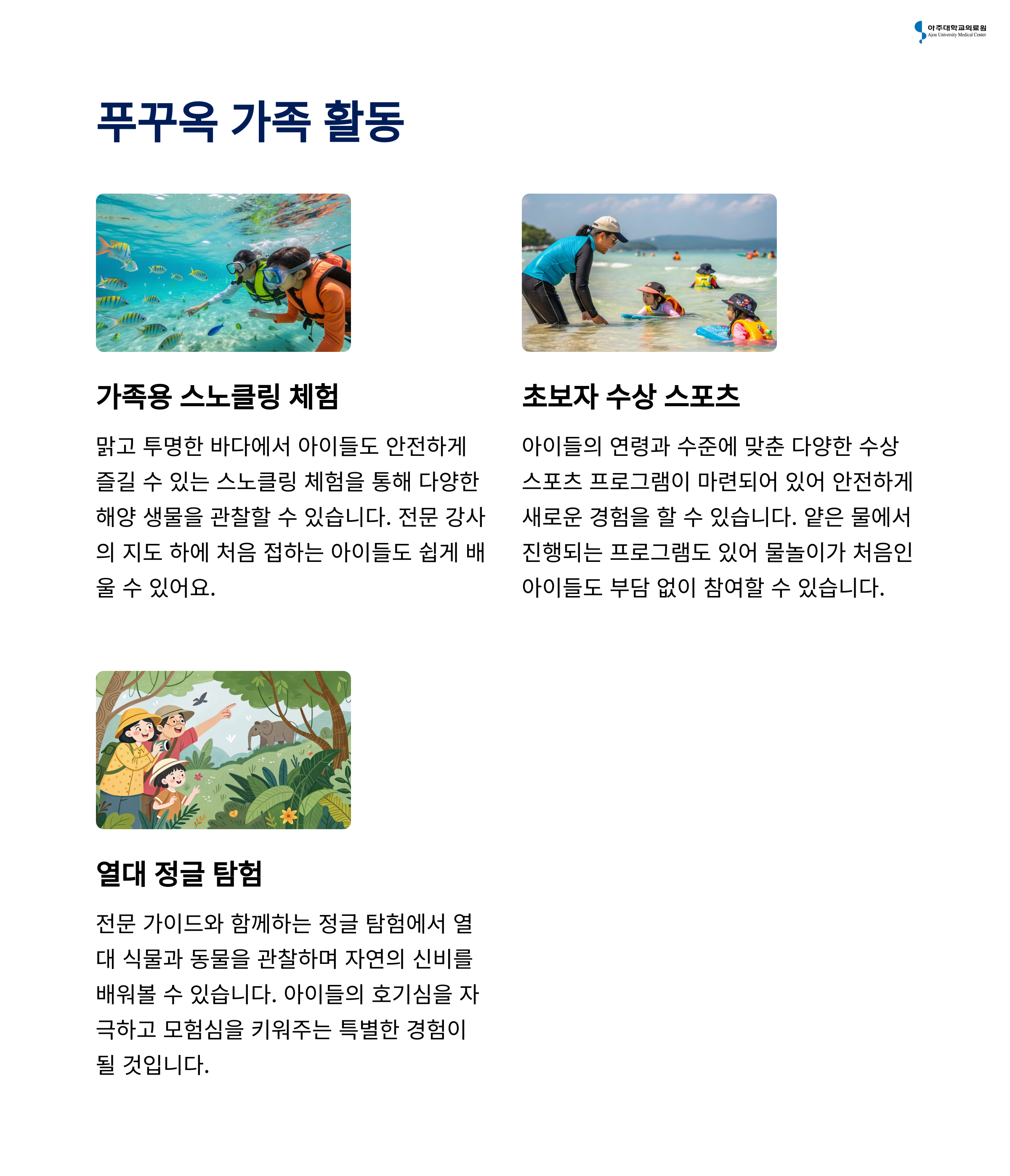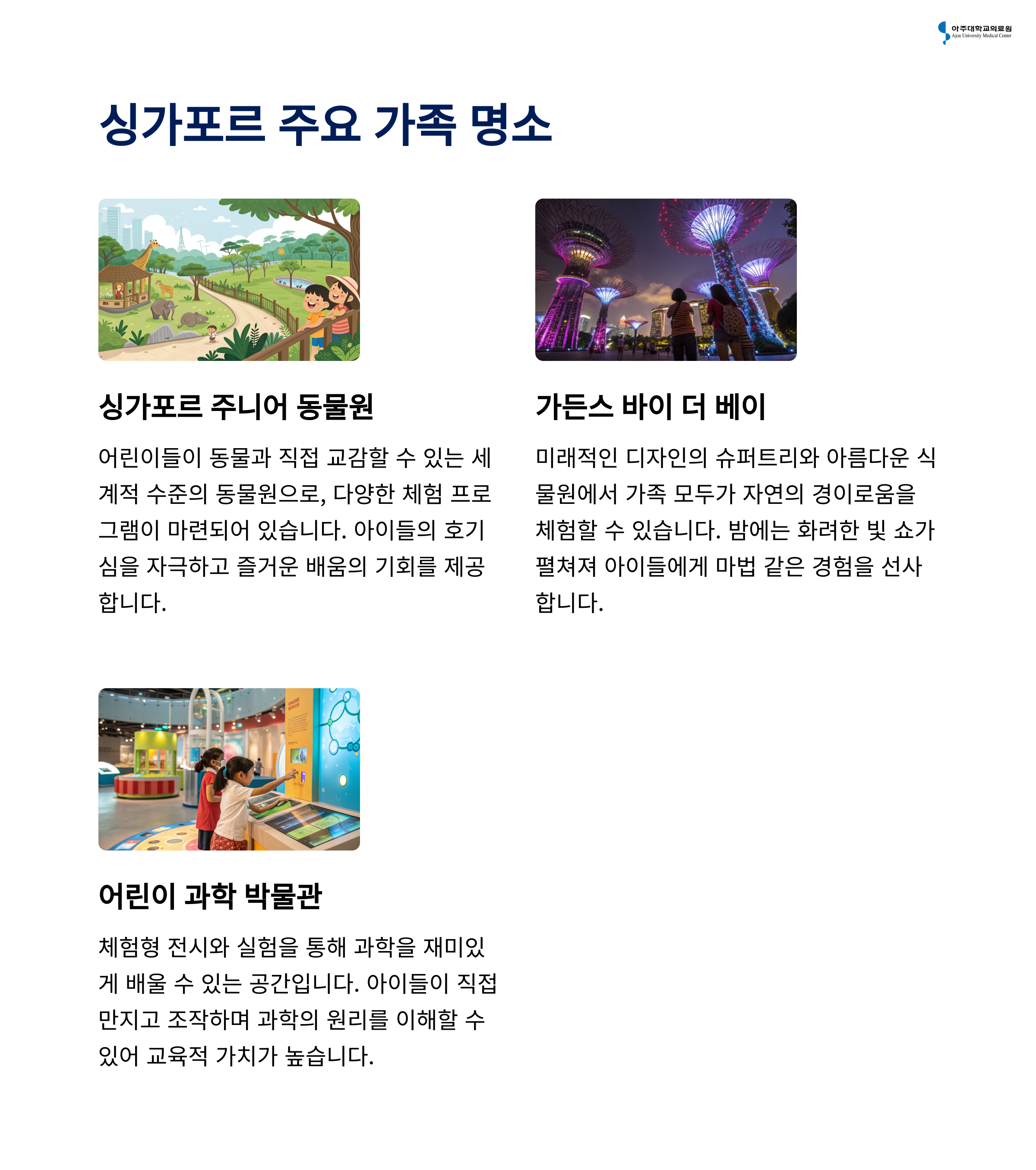 | 깨끗한 환경, 유모차 이동 용이, 대중교통 발달 | 저렴한 물가, 가족 맞춤 액티비티 풍부 | 짧은 비행, 휴양+체험 결합, 키즈풀 리조트 다수 |