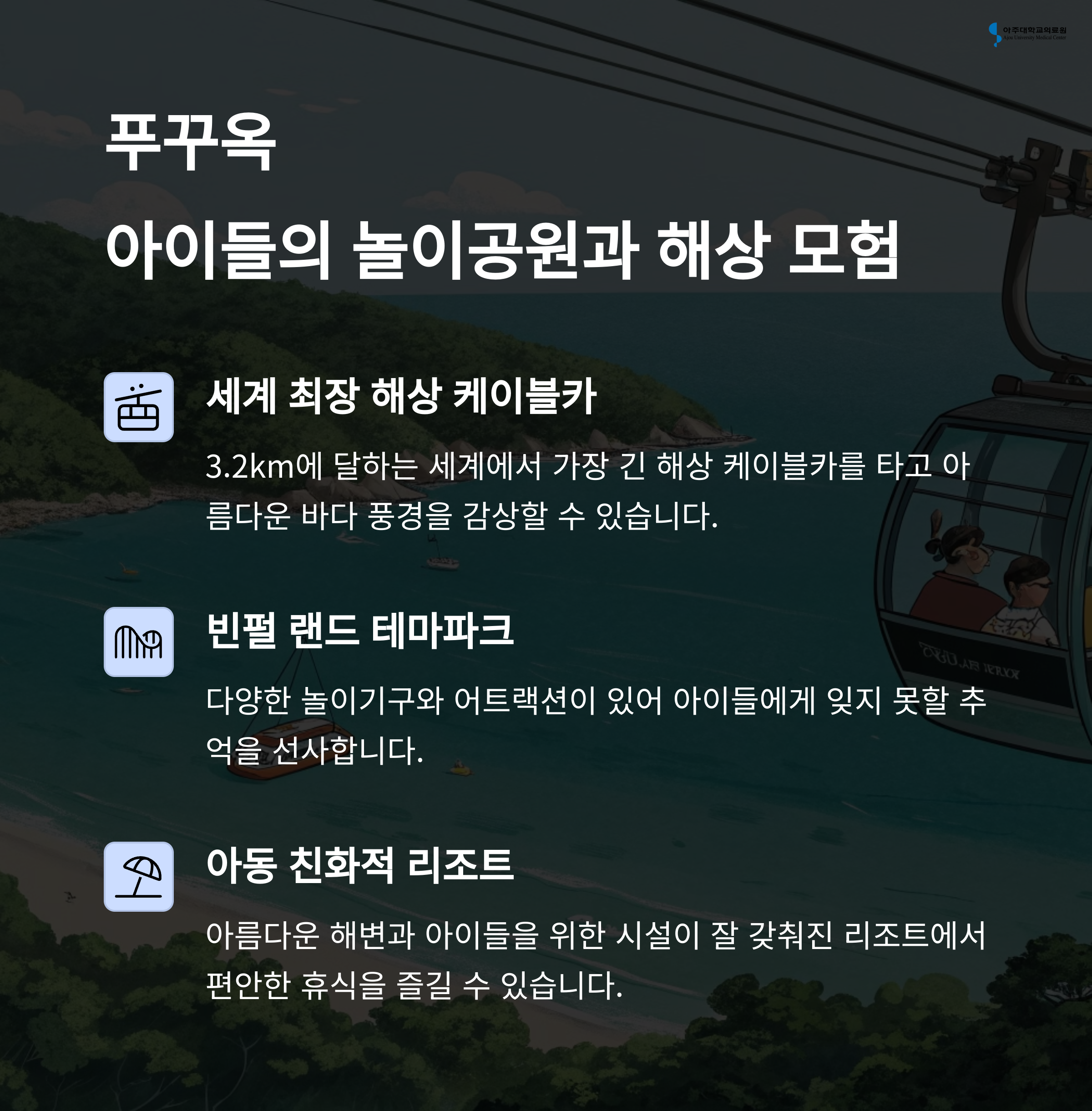다음은 베트남 푸꾸옥입니다. 가족 단위 여행객들에게 꾸준히 사랑받는 곳이죠. 특히 아이들과 함께 빈원더스 테마파크에 방문했을 때는 아이들이 신나서 연신 뛰어다녔어요. 사오 해변에서는 얕고 맑은 바다에서 안전하게 물놀이를 즐길 수 있었고, 해질 무렵 푸꾸옥 야시장에서 맛본 현지 음식과 달콤한 망고는 정말 잊을 수 없는 맛이었답니다. 가장 인상 깊었던 건 해상 케이블카를 타고 혼똠 섬을 오가는 경험이었는데, 바다 위를 나는 듯한 풍경에 온 가족이 감탄을 금치 못했어요.