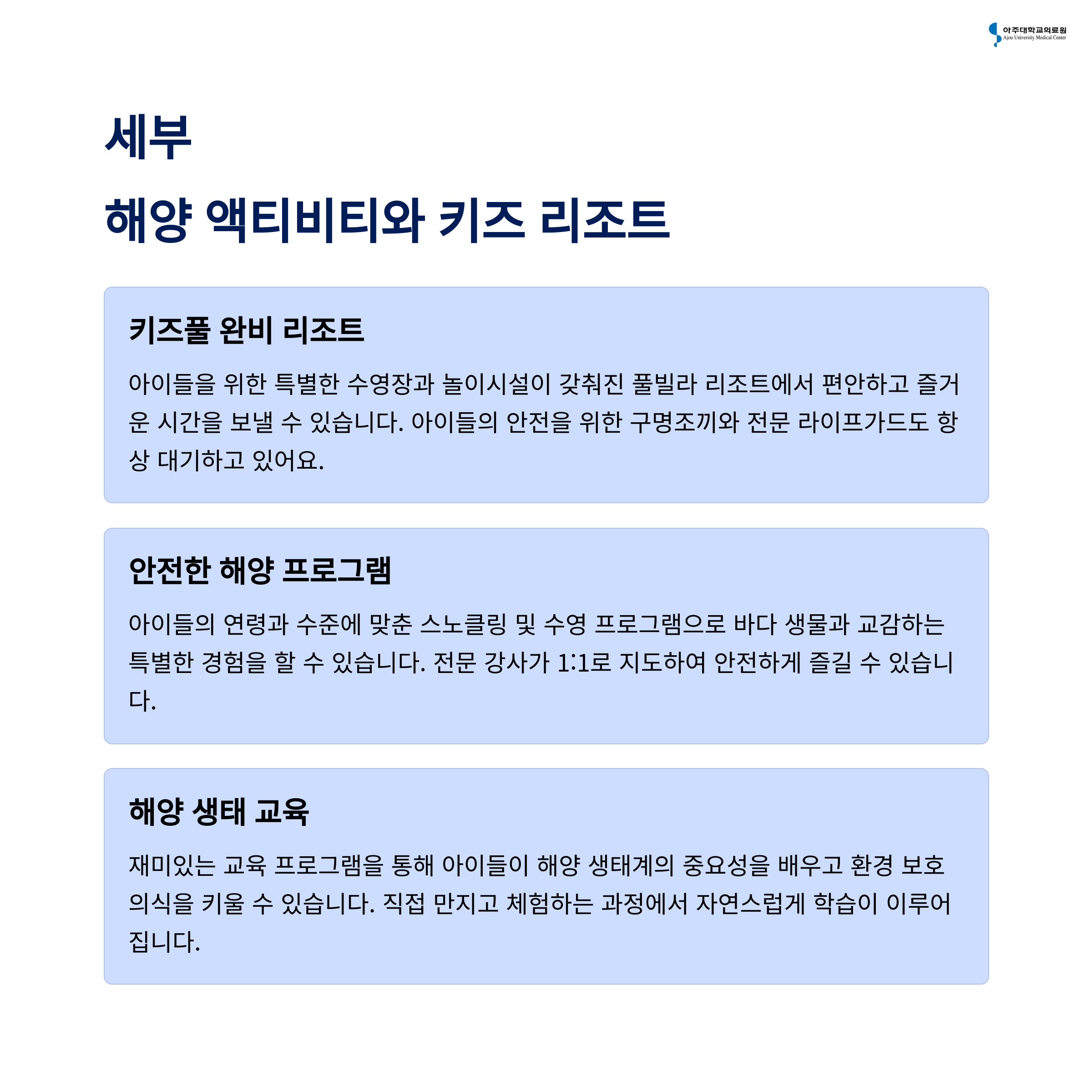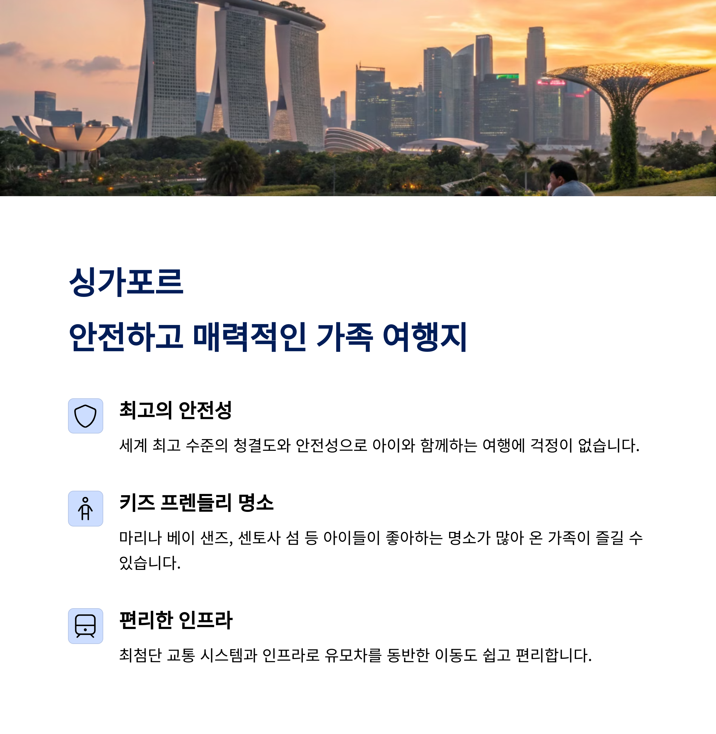 | 깨끗한 환경, 유모차 이동 용이, 대중교통 발달 | 저렴한 물가, 가족 맞춤 액티비티 풍부 | 짧은 비행, 휴양+체험 결합, 키즈풀 리조트 다수 |