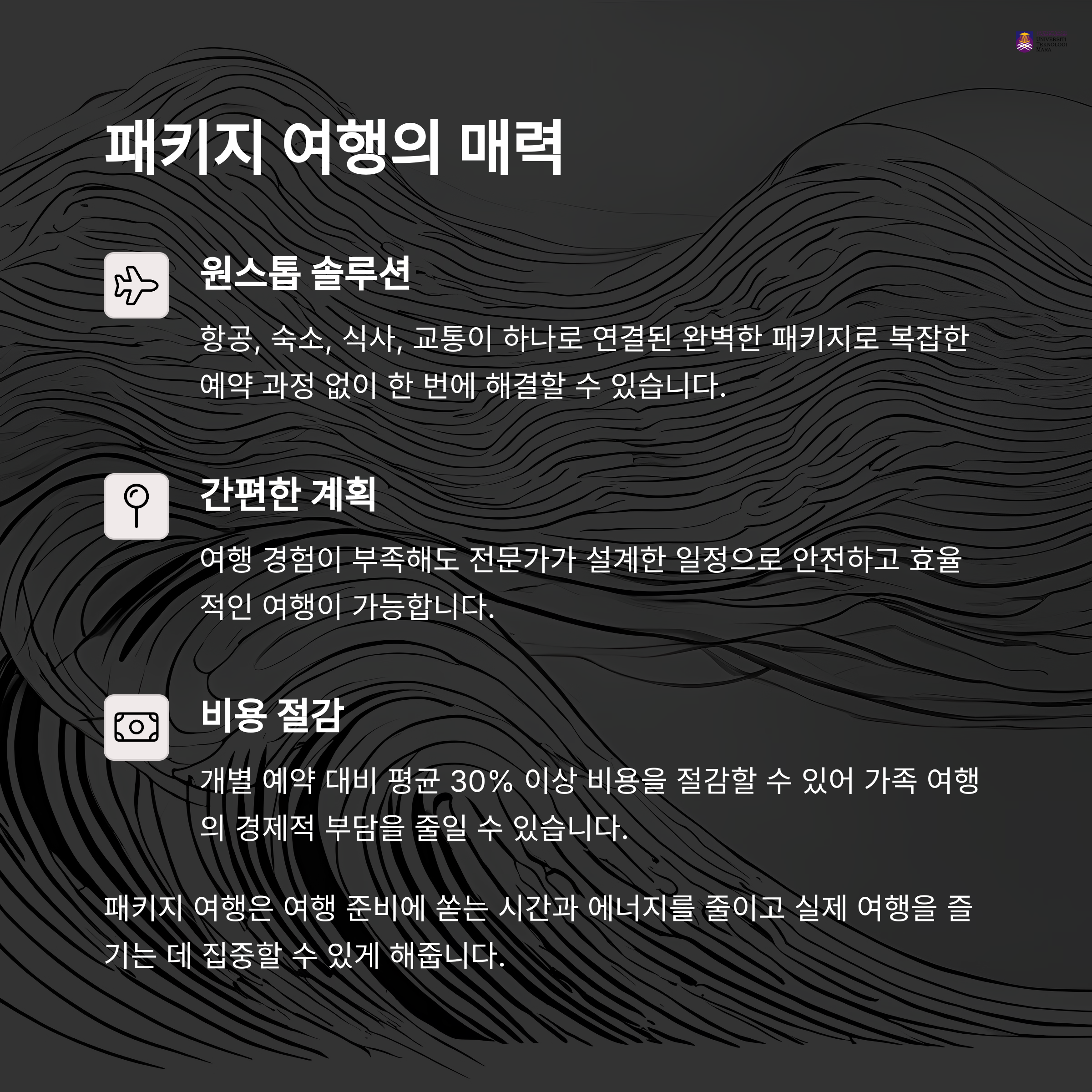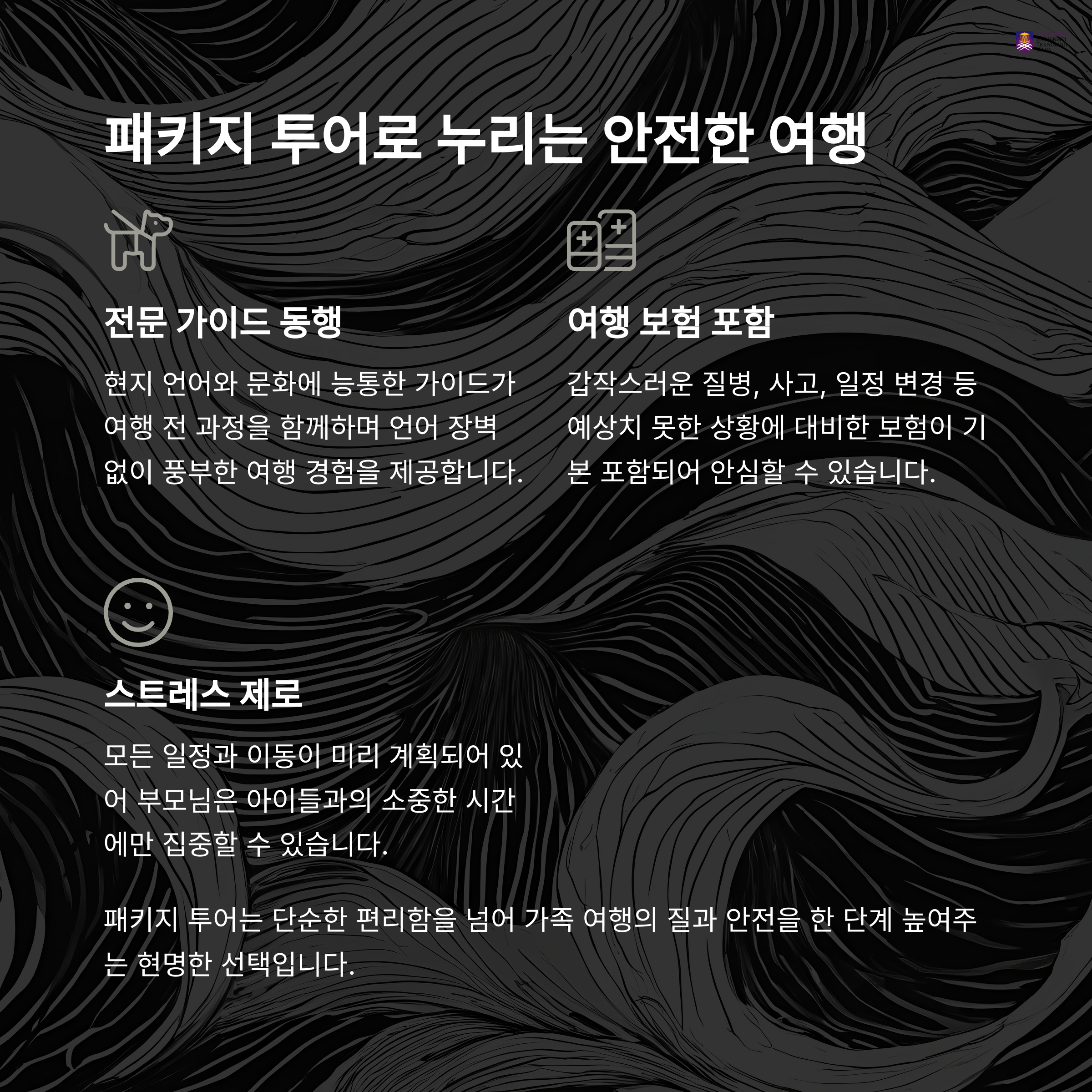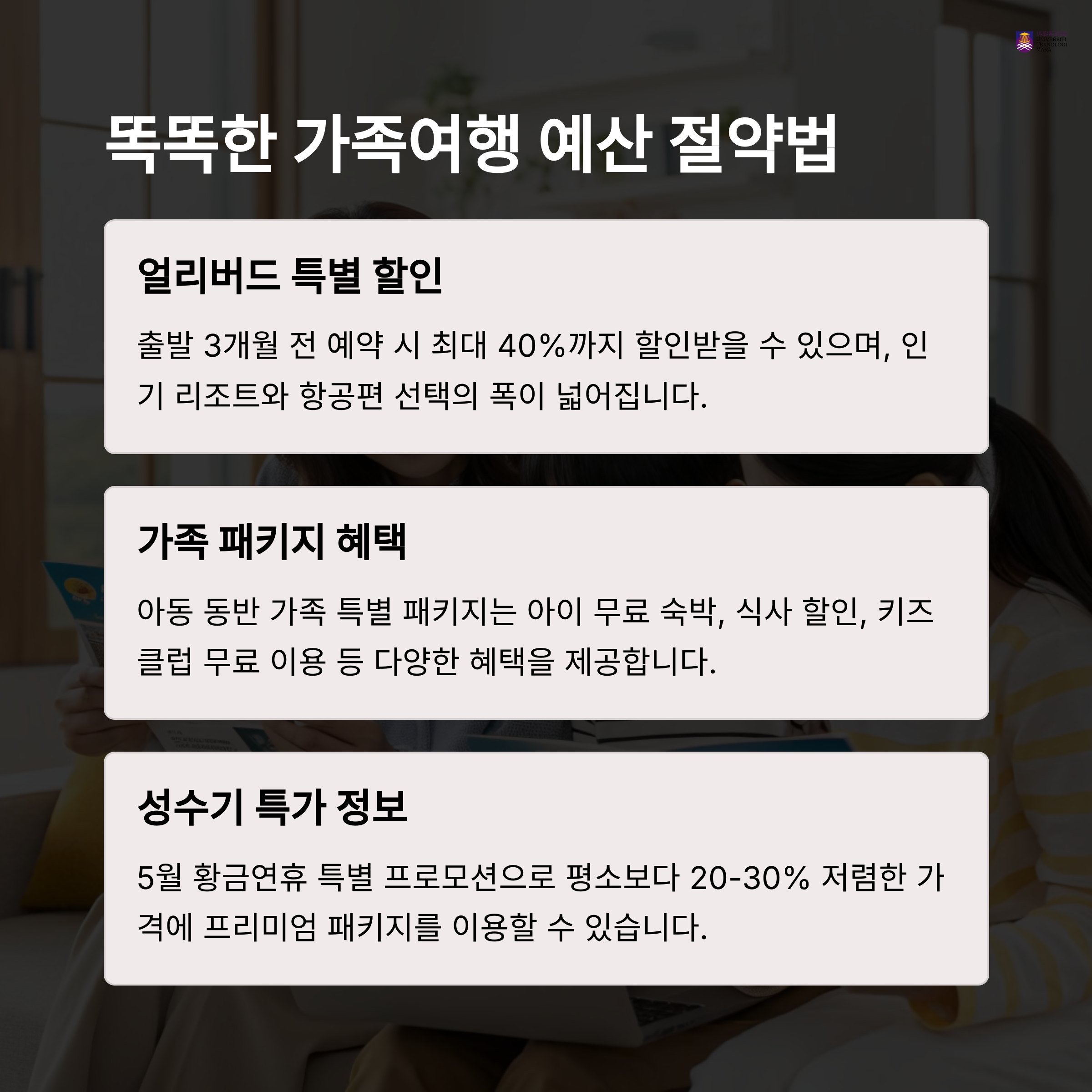 항공·숙소·식사 포함 패키지에 단체 할인까지 적용되면 전체 여행 경비는 오히려 절감될 수 있습니다. 특히 어린이 동반 시 혜택이 많습니다.
